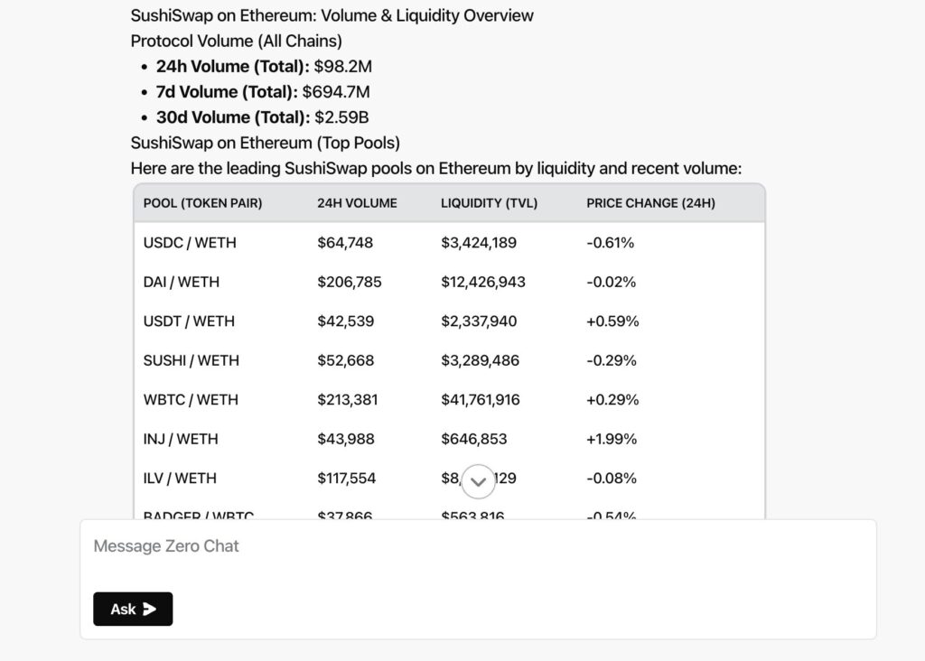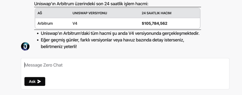 Kripto dünyası hızla büyürken, merkeziyetsiz borsaların (DEX) önemi giderek artıyor. Yatırımcılar ve trader’lar için işlem hacimleri, likidite havuzları ve ağ bazlı analizler kritik rol oynuyor. İşte tam bu noktada Zero Chat, kullanıcıların en iyi verileri kolayca elde edebileceği bir kripto asistanı olarak devreye giriyor.